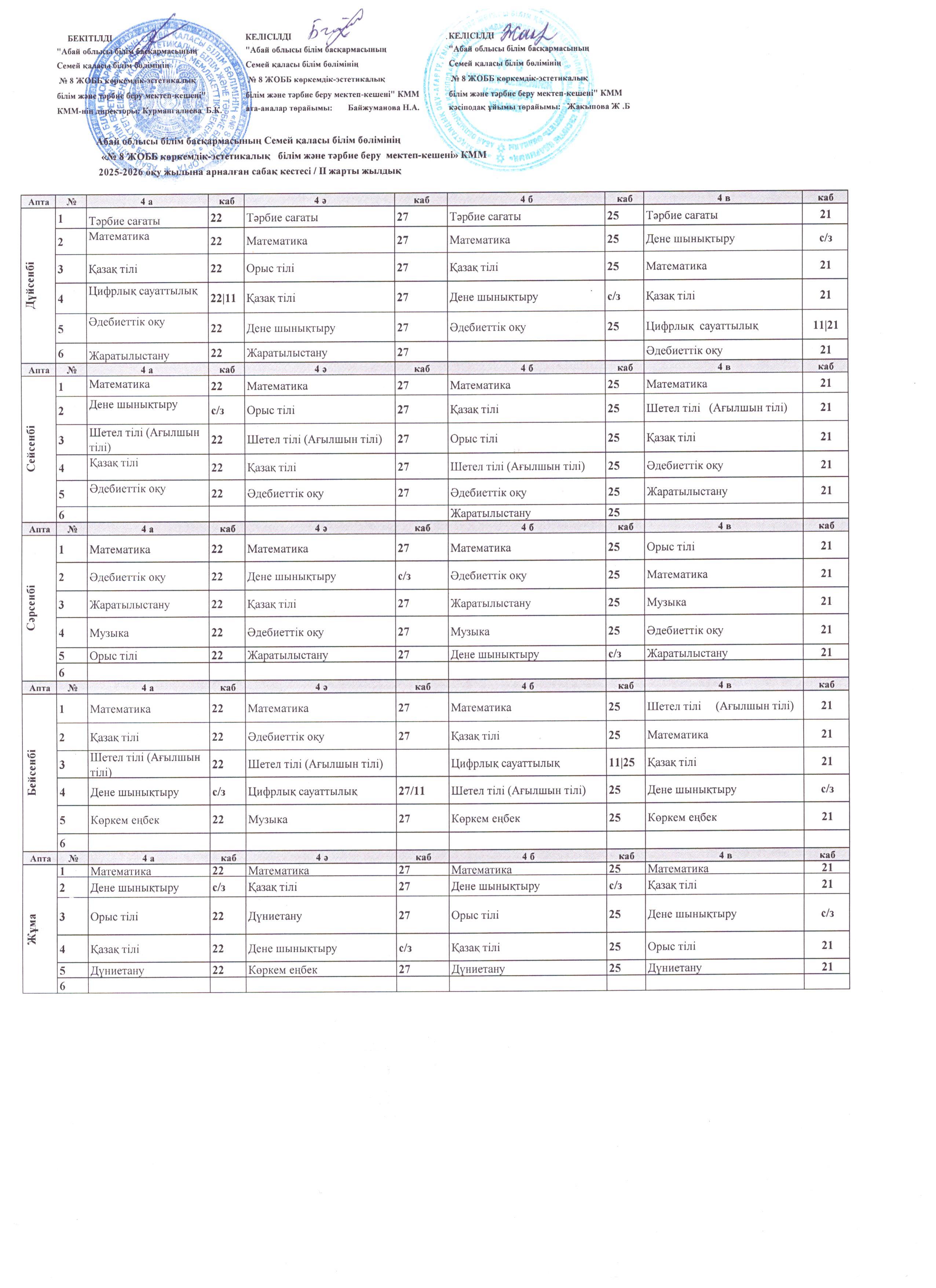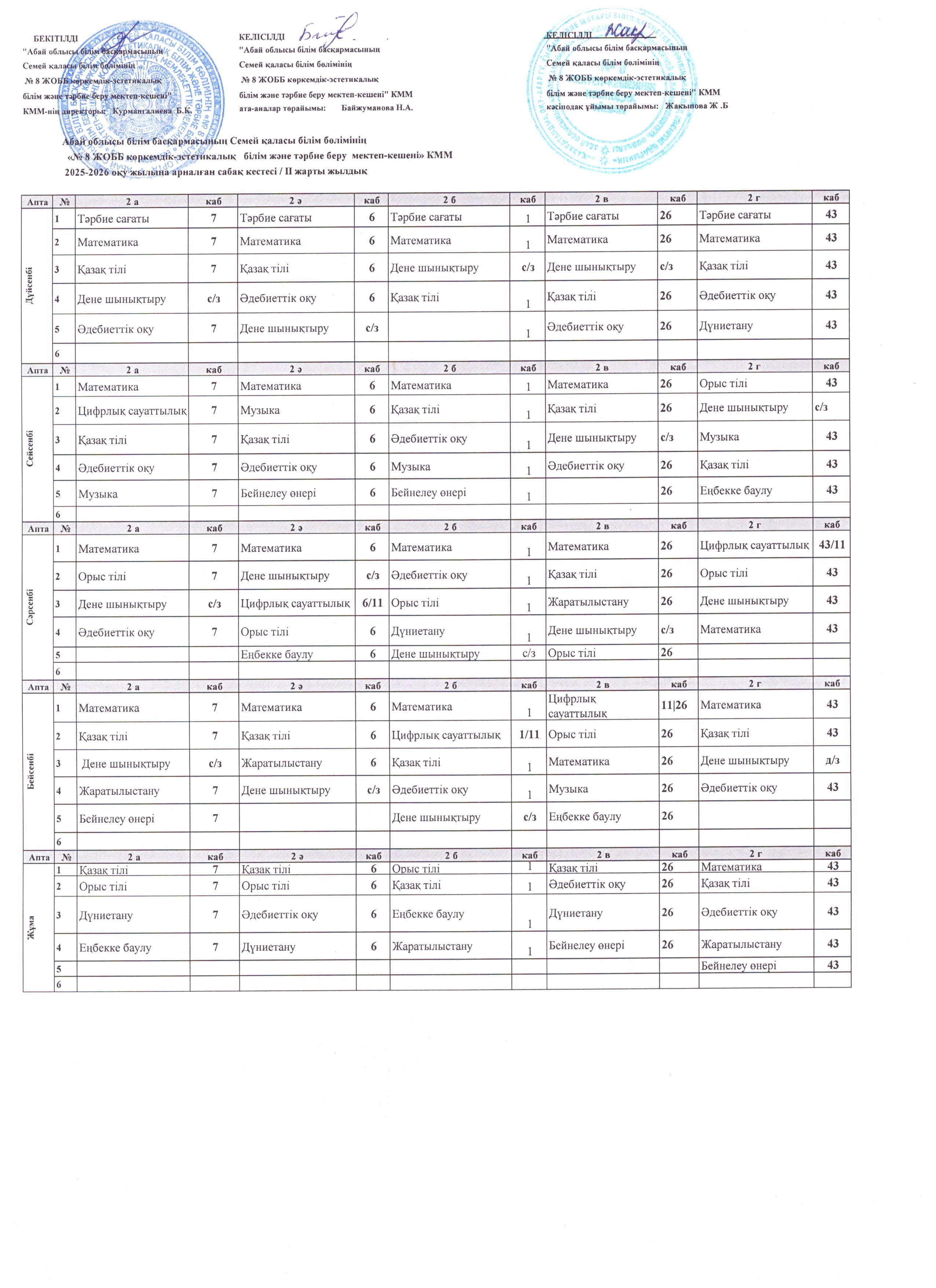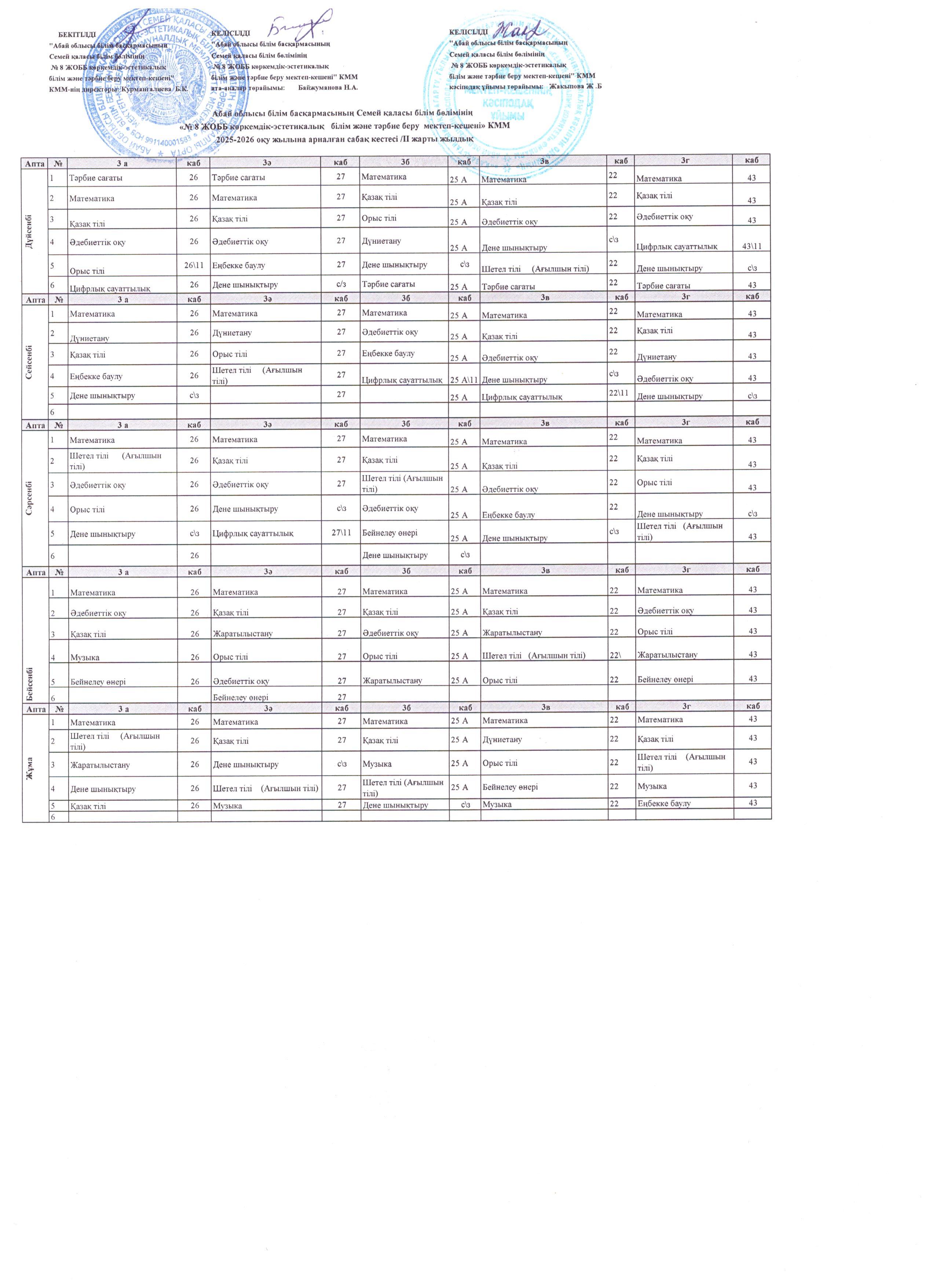 2025-2026 оқу жылындағы 1-4 сыныптардың 1 жартыжылдық сабақ кестесі » Средняя общеобразовательная школа № 8
