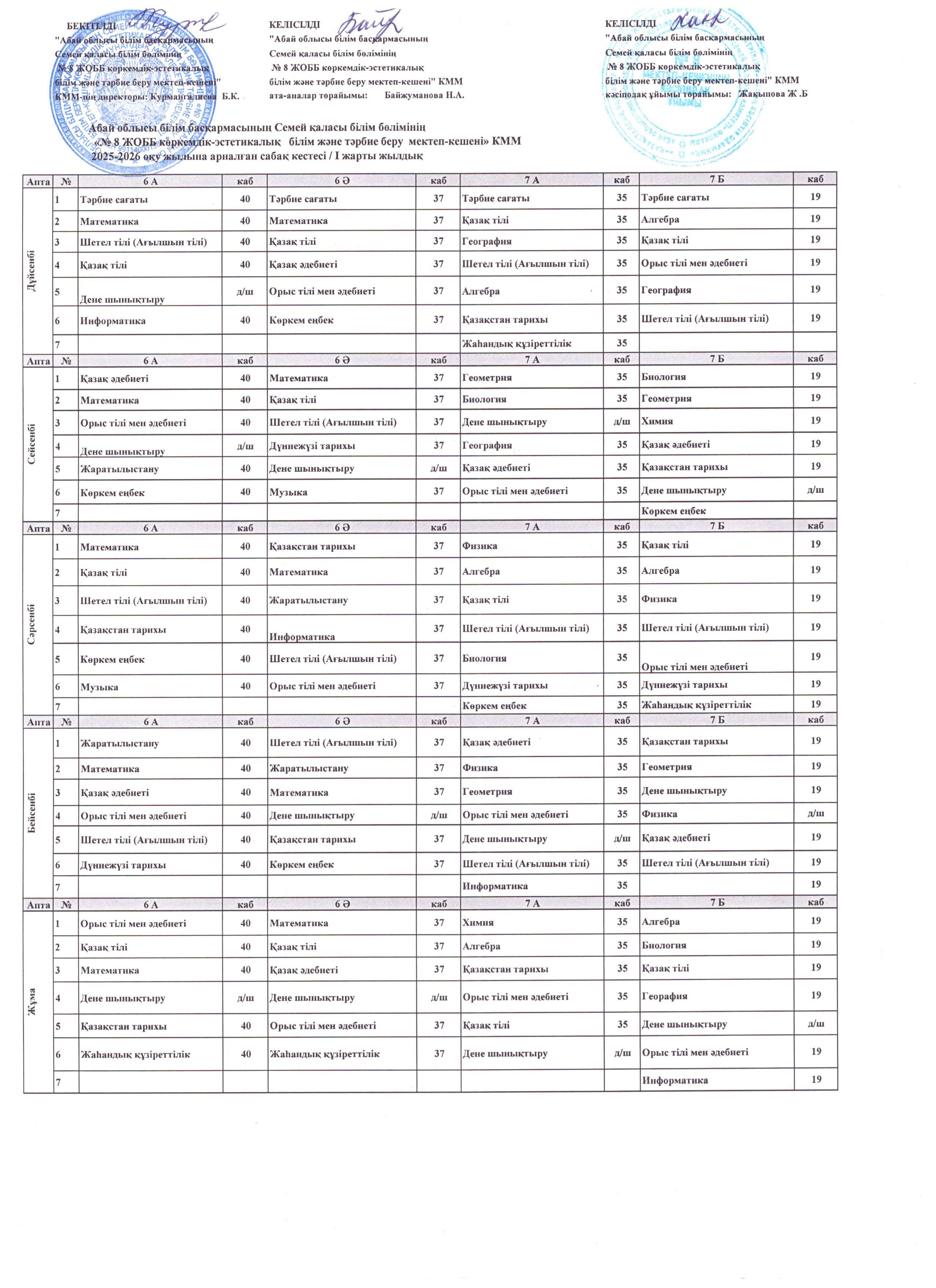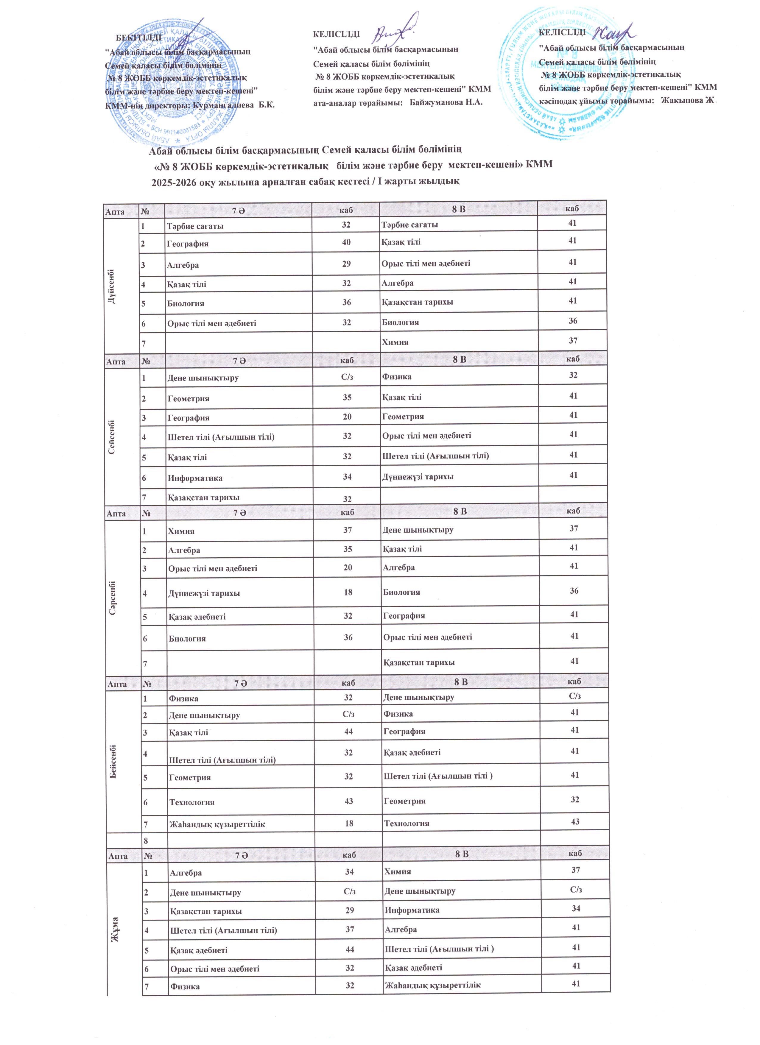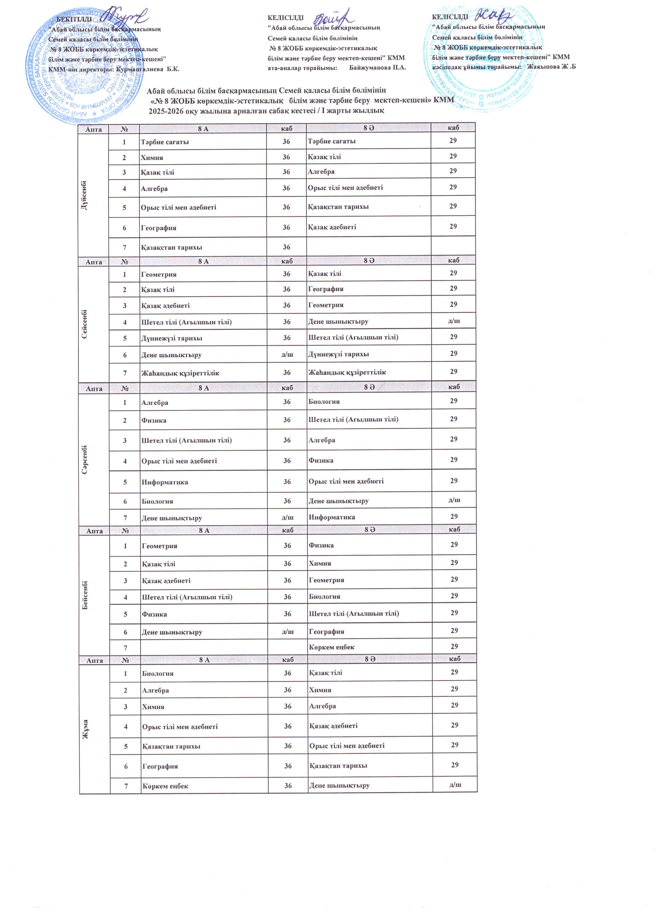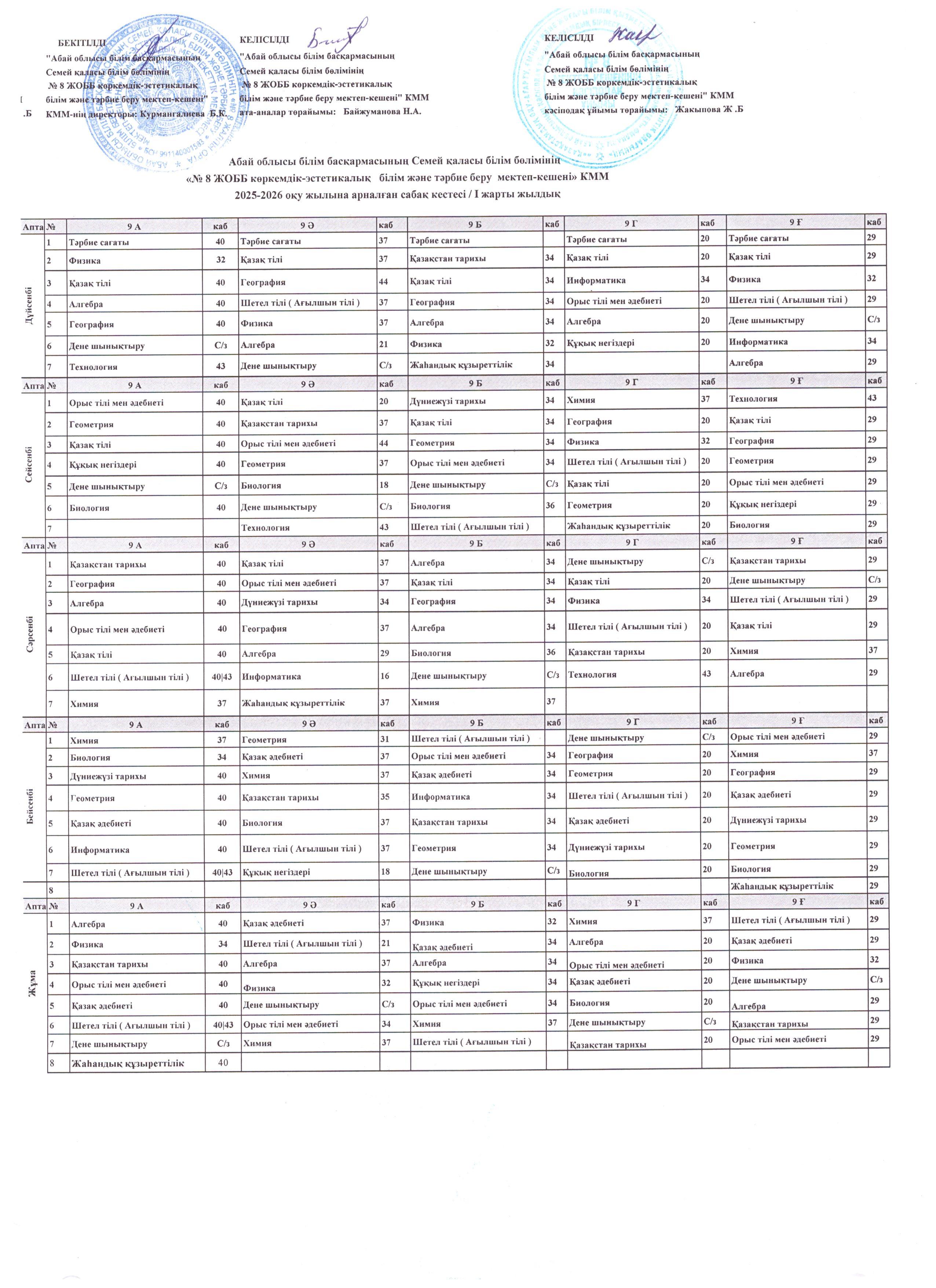 2025-2026 оқу жылындағы 5-9 сыныптардың 1 жартыжылдық сабақ кестесі » Средняя общеобразовательная школа № 8
