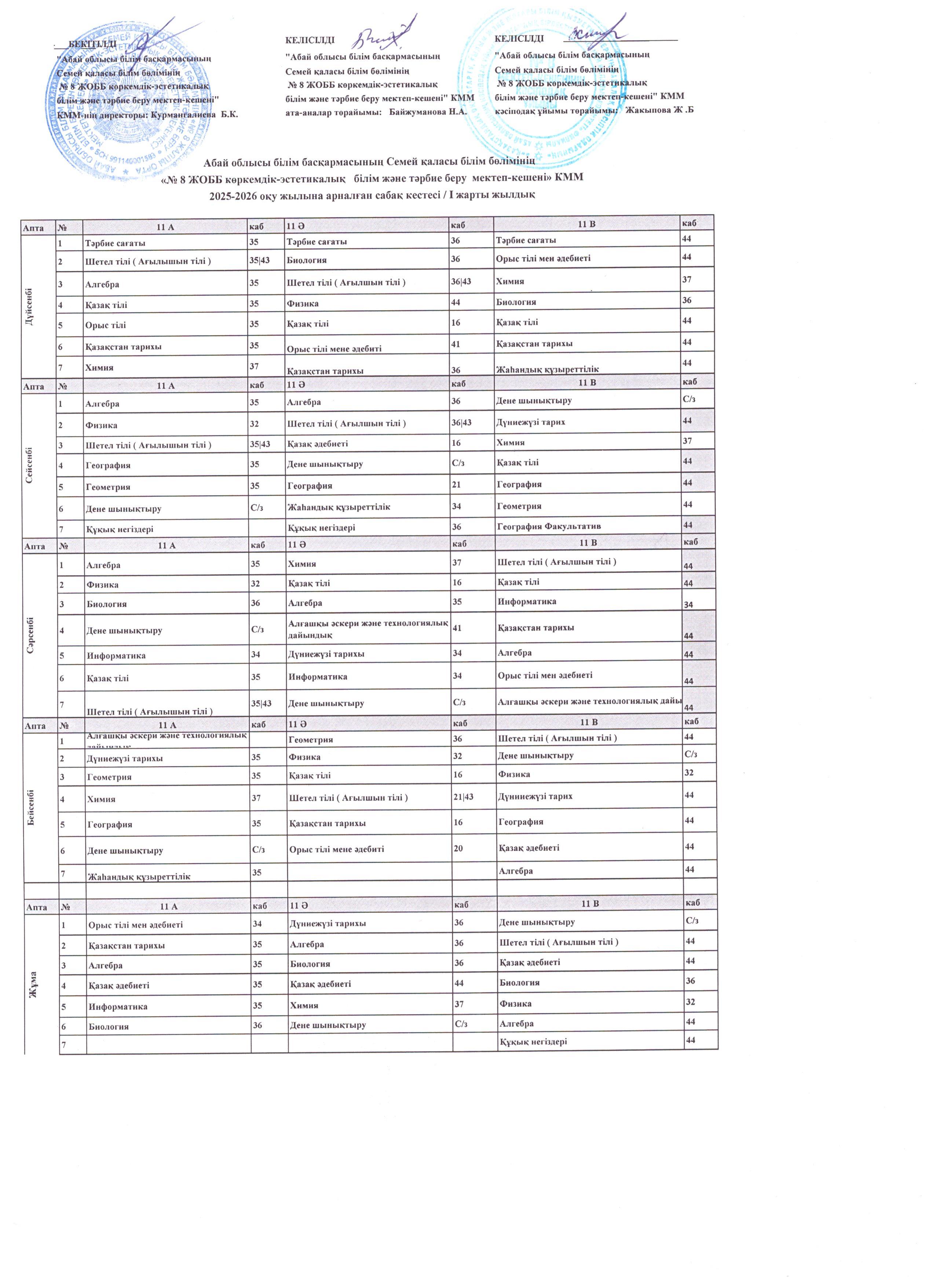 2025-2026 оқу жылындағы 10-11 сыныптардың 1 жартыжылдық сабақ кестесі » Средняя общеобразовательная школа № 8
