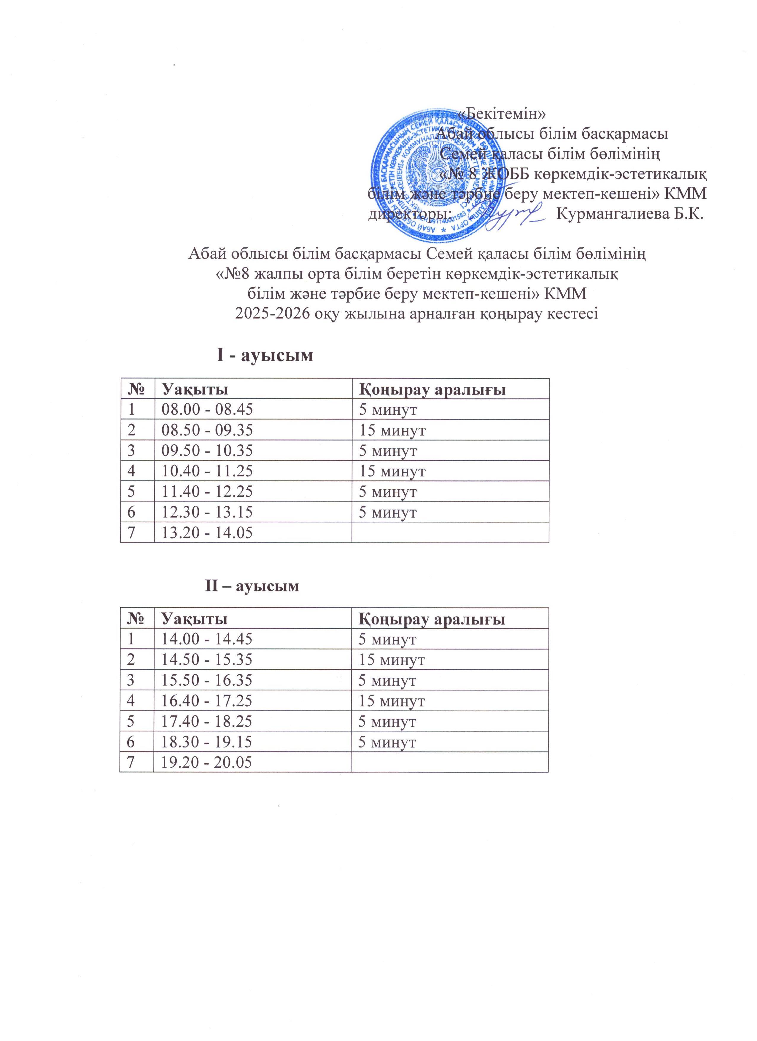 2025-2026 оқу жылына арналған қоңырау кестесі » Средняя общеобразовательная школа № 8
