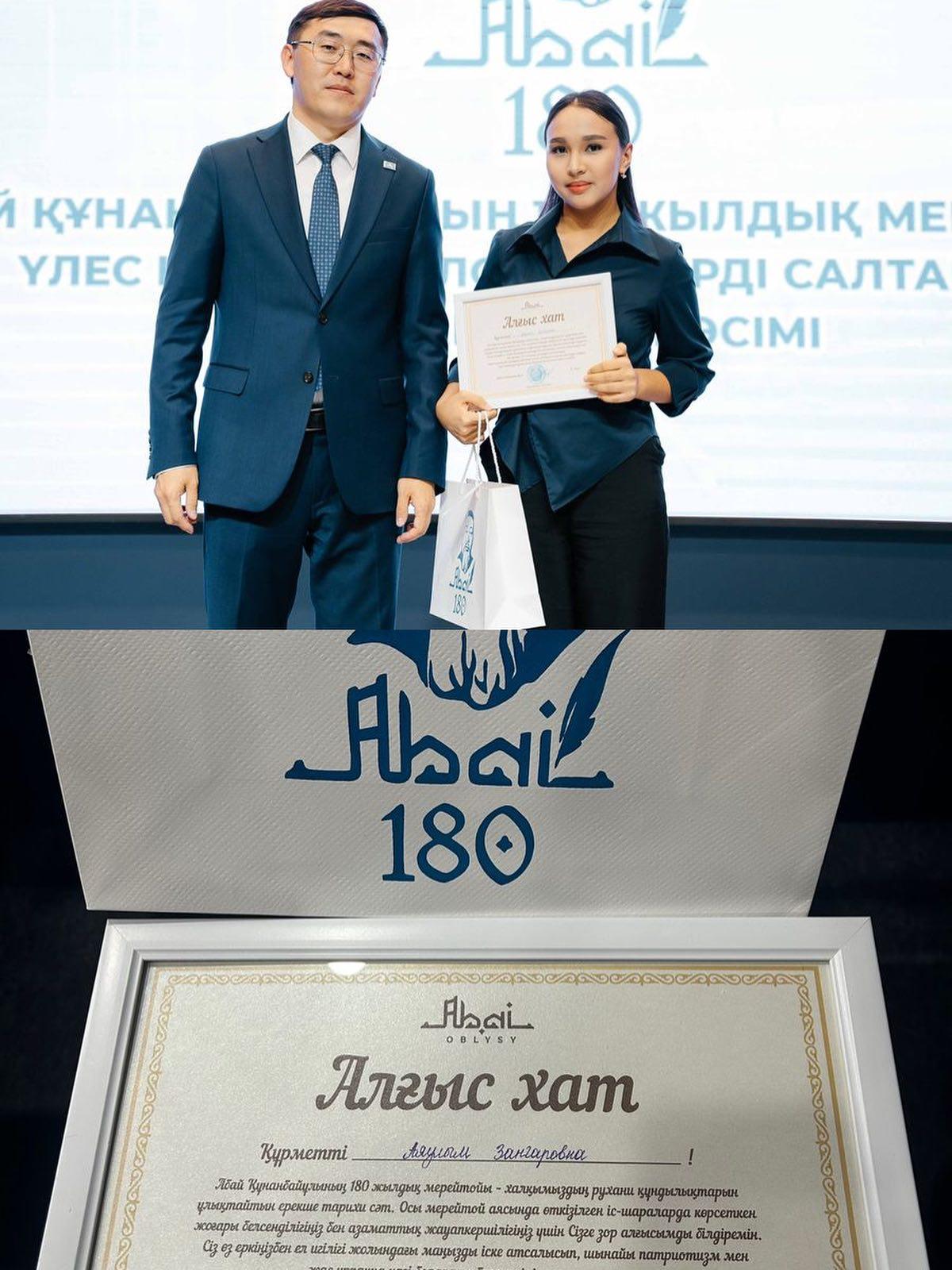 Семей қаласы білім бөлімінің «№8 жалпы орта білім беретін көркемдік-эстетикалық білім және тәрбие беру мектеп-кешені» КММ  10 “А” сынып оқушысы  Андреева  Аяулым  Абайдың 180 жылдығы мерейтой  аясында өткізген іс-шараларда  көрсеткен  жоғары белсенділігі мен жауапкершілігі, ерікті еңбегі  үшін  Абай облысының әкімінің  Алғыс хатымен марапатталды.  Аяулым  өз еркімен ел игілігі  жолындағы маңызды іске ат салысып , шынайы патриотизм  мен жас ұрпаққа үлгі боларлық белсенділік танытуда.  Құттықтаймыз!